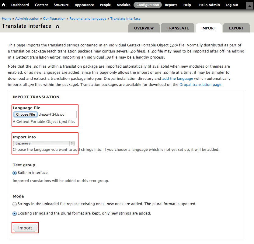翻訳ファイルのインポートページヘ移動します。(admin/config/regional/translate/import)