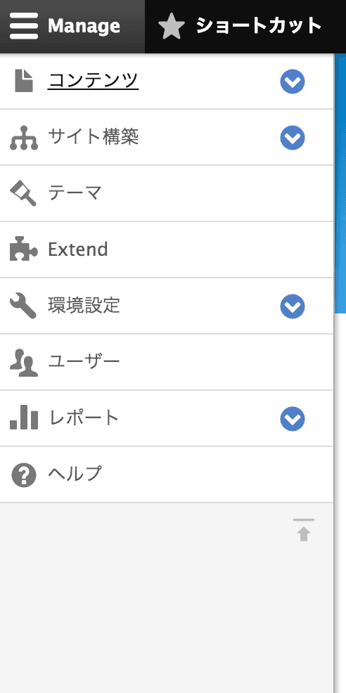Drupal 8 のメニューには、デフォルトで次の項目が並んでいます。