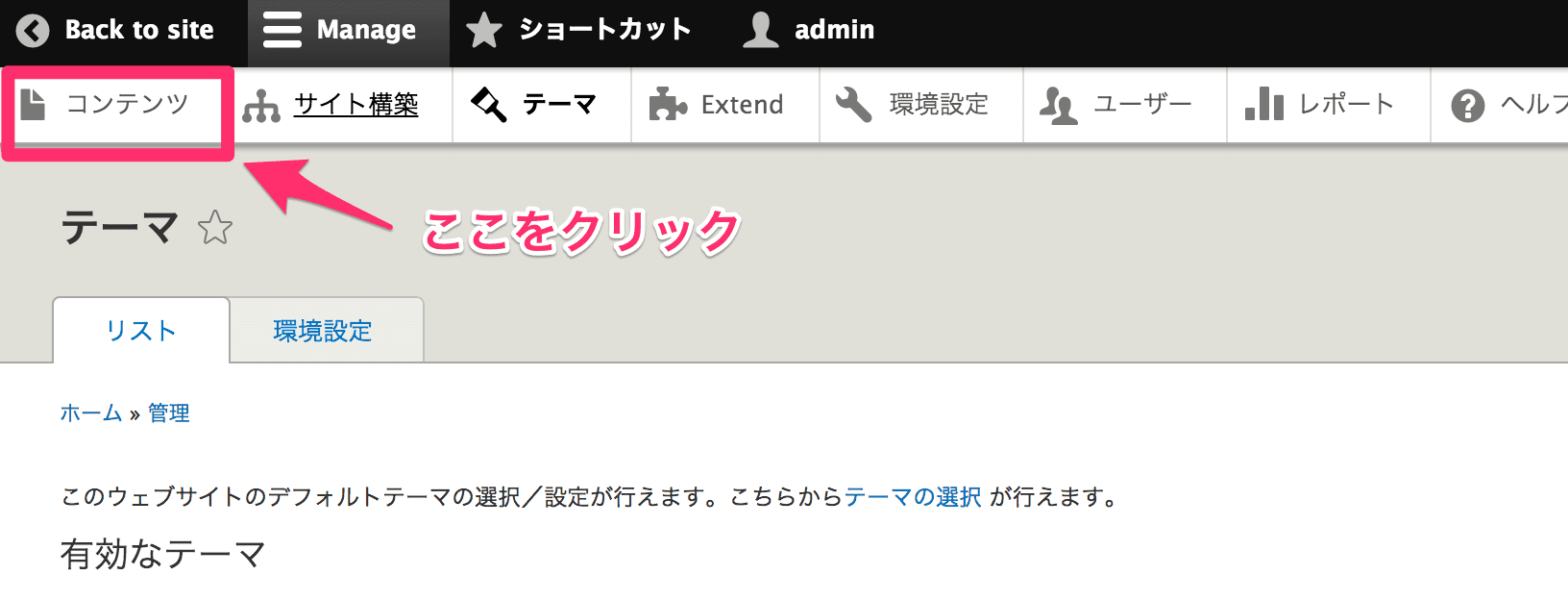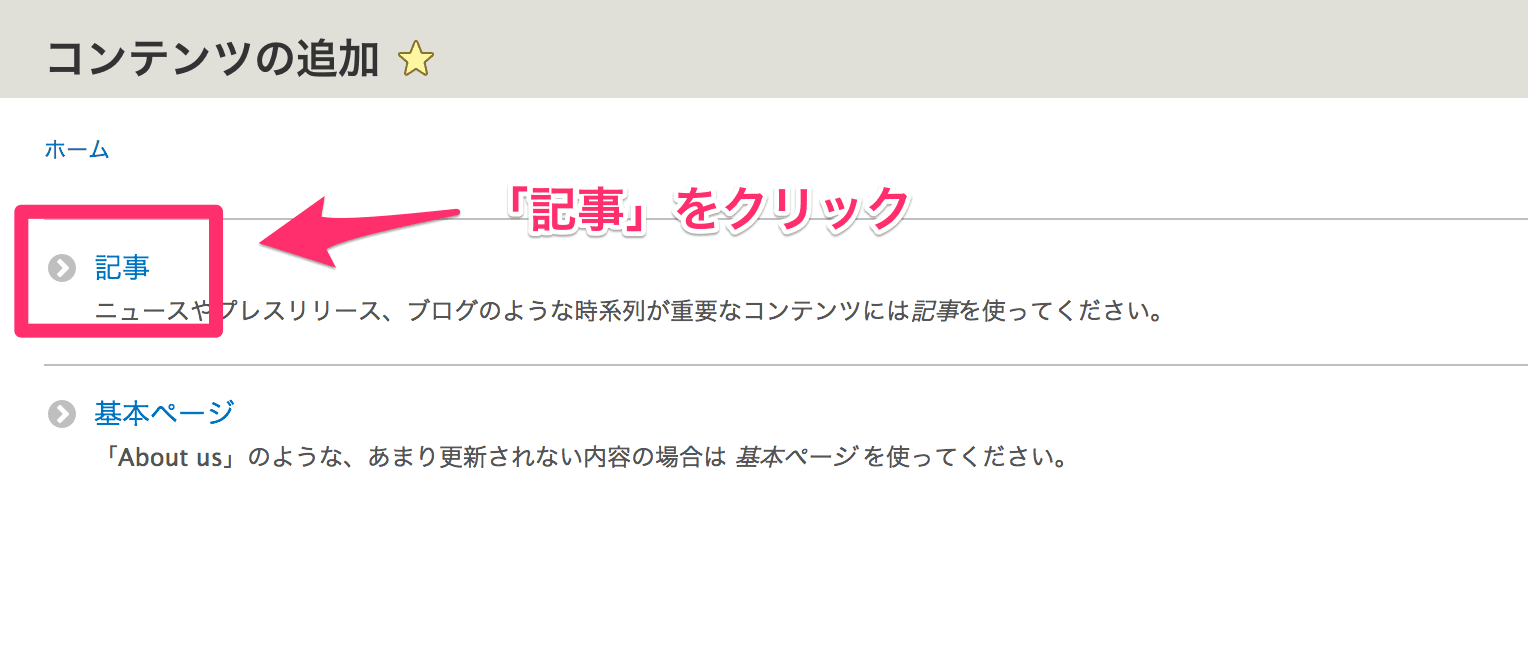 コンテンツの追加方法も見てみましょう(ちなみに Drupal ではコンテンツのことを「ノード」と呼びます)。 CMS といえば、管理画面からのコンテンツ追加ですよね。