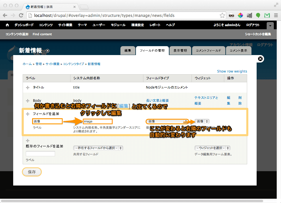 さっき入力したデータは全て削除&元に戻して、 既存のフィールドを追加 の - 存在するフィールドから選択 から field_image のやつを選択します。そうしたら色々自動で追加されるのでラベルだけちょっと変更して保存します。