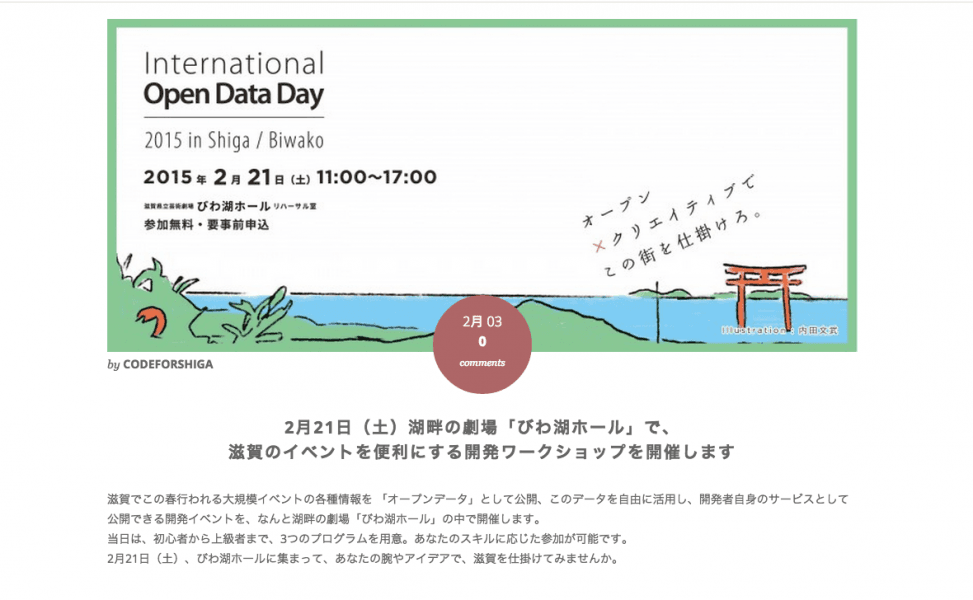 - 内容: 滋賀で 2015 年に予定されている 2 つのイベントのデータを使った開発ワークショップ