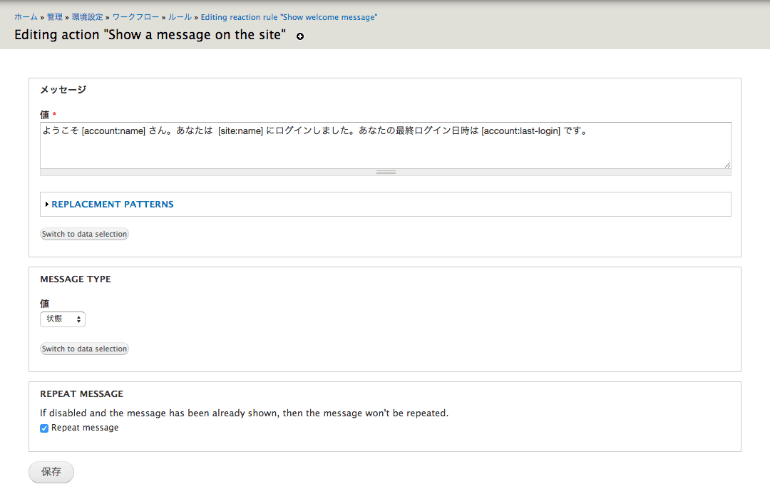 ここは例として「名前」に「 Show welcome message 」と入力し、「 React on Event 」は「 User has logged in 」を選択します。 こちらはユーザが Drupal サイトにログインしたときに起動するルールです。