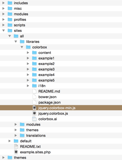 以下のパス構造となるように、 jquery.colorbox-min.js ファイルをダウンロードして設置してください。