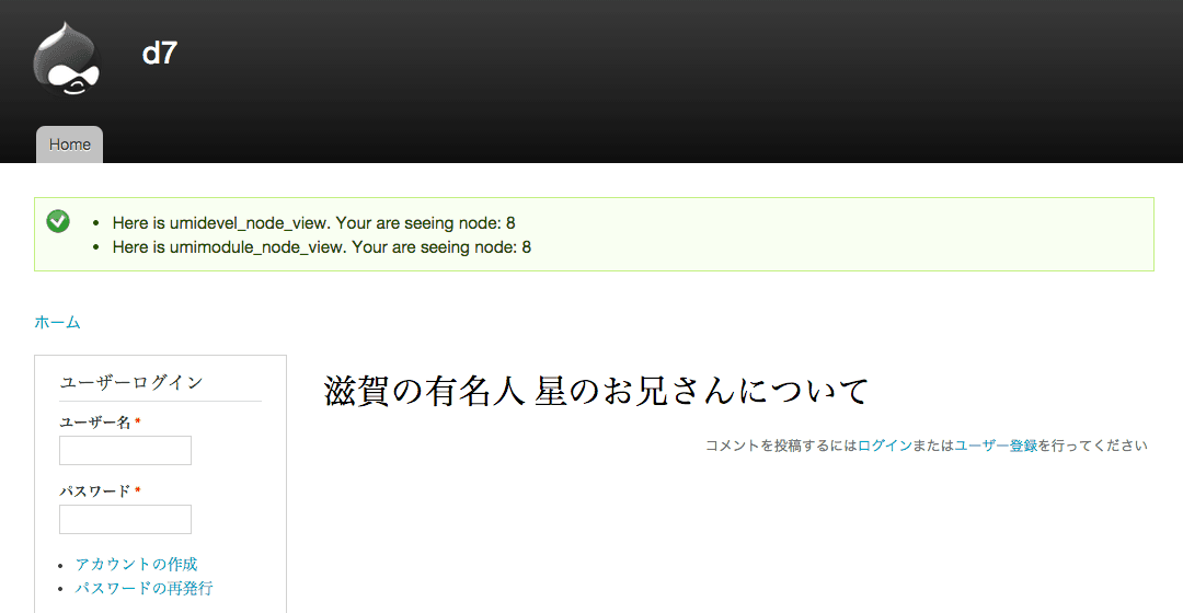すると次は、コンテンツのページに「 Here is ... 」のメッセージが umimodule_node_view のメッセージとはまた別に表示されるようになります。