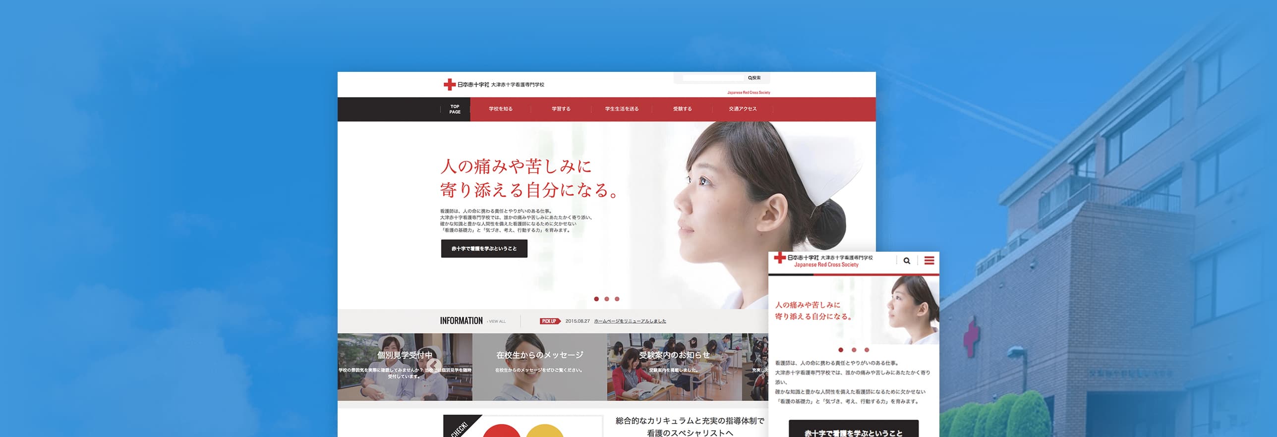 大津赤十字病院様のWebサイトリニューアルに合わせて、滋賀県大津市にある大津赤十字看護専門学校様のホームページのリニューアルも担当させていただきました。 大津赤十字看護専門学校様は滋賀県大津市に明治37年に誕生した歴史と伝統ある看護専門学校です。確かな技術力と温かい心を持った質の高いサポートができる看護のプロをこれまでにも多く育成されてきました。 今回はそんな素晴らしい学校の魅力がより伝わるWebサイトへと一新するため、病院サイトのリニューアルに合わせて弊社にリニューアルをご依頼いただきました。